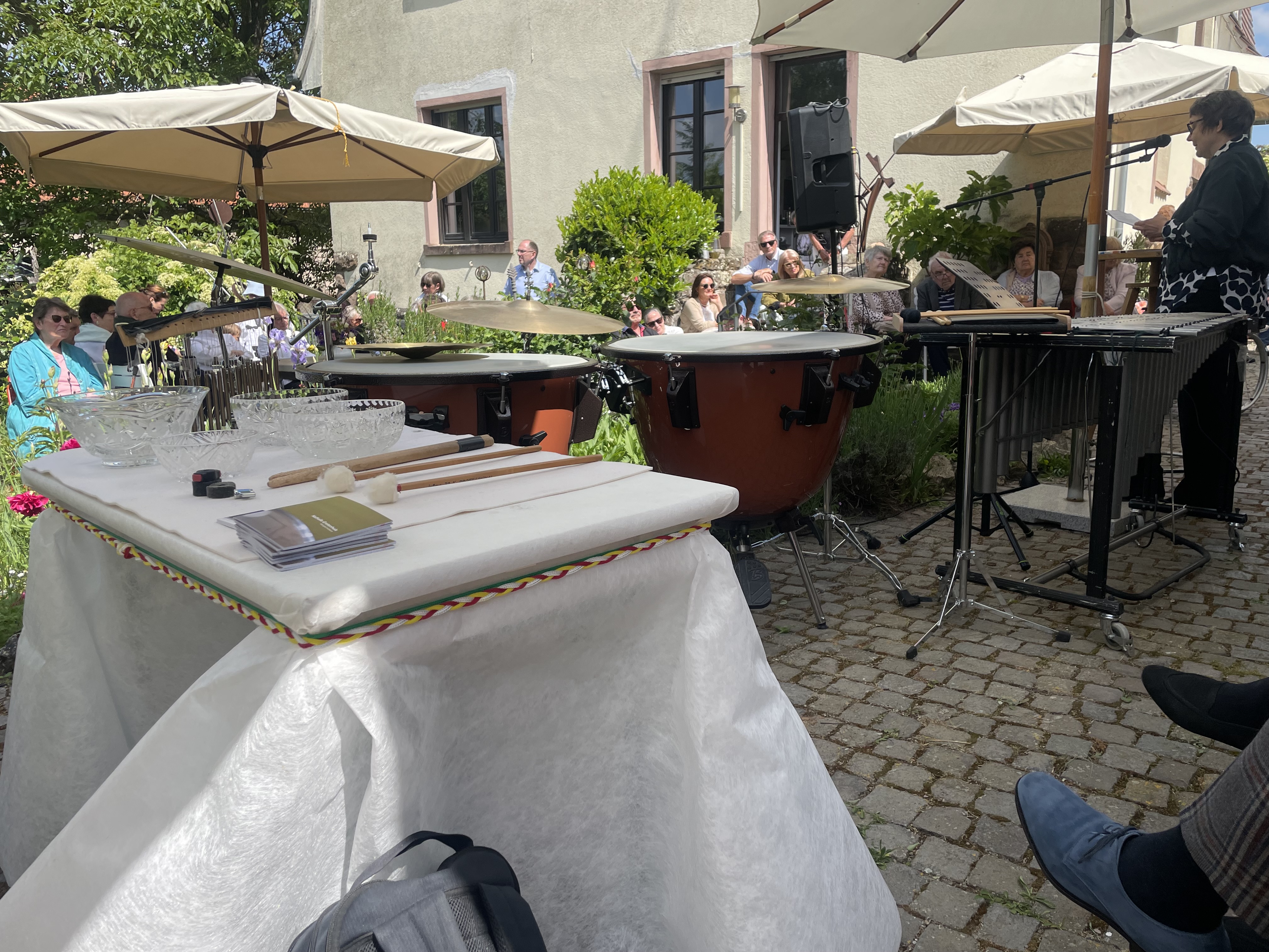 14 Uhr, 19 Uhr: Live-Aufführungen im Hof mit Eigenkompositionen für Schlagwerk und Sound 12 Uhr, 16 Uhr: Drum-Circle zum Mitmachen (max. 6 Personen)